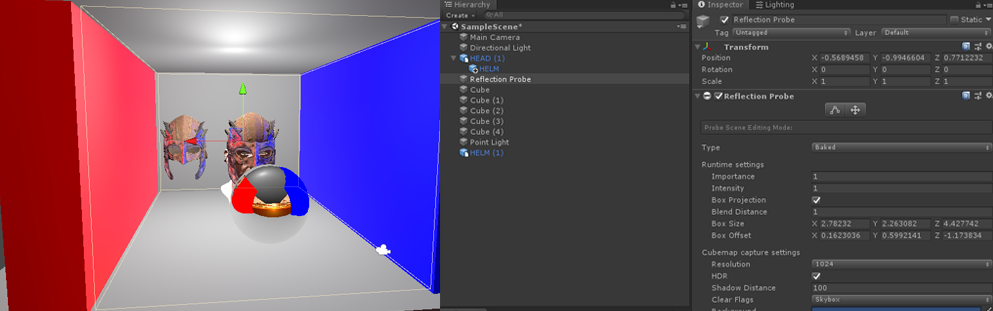 리플렉션 프로브 A 리플렉션 프로브(Reflection Probe)는 둘러싼 모든 방향의 구면 표시를 캡처하는 카메라와 같은 것으로 보면 됩니다. 캡처된 이미지는 Cubemap로 저장되어, 반사 재질을 가지는 객체