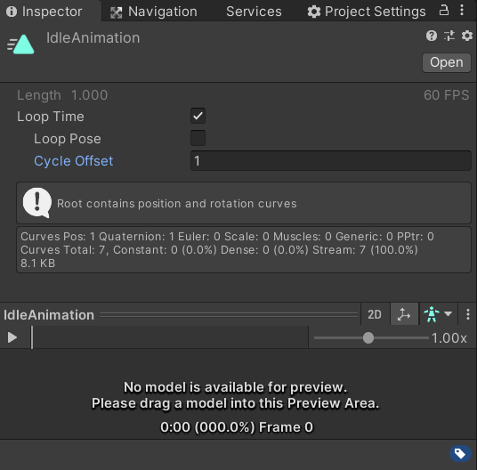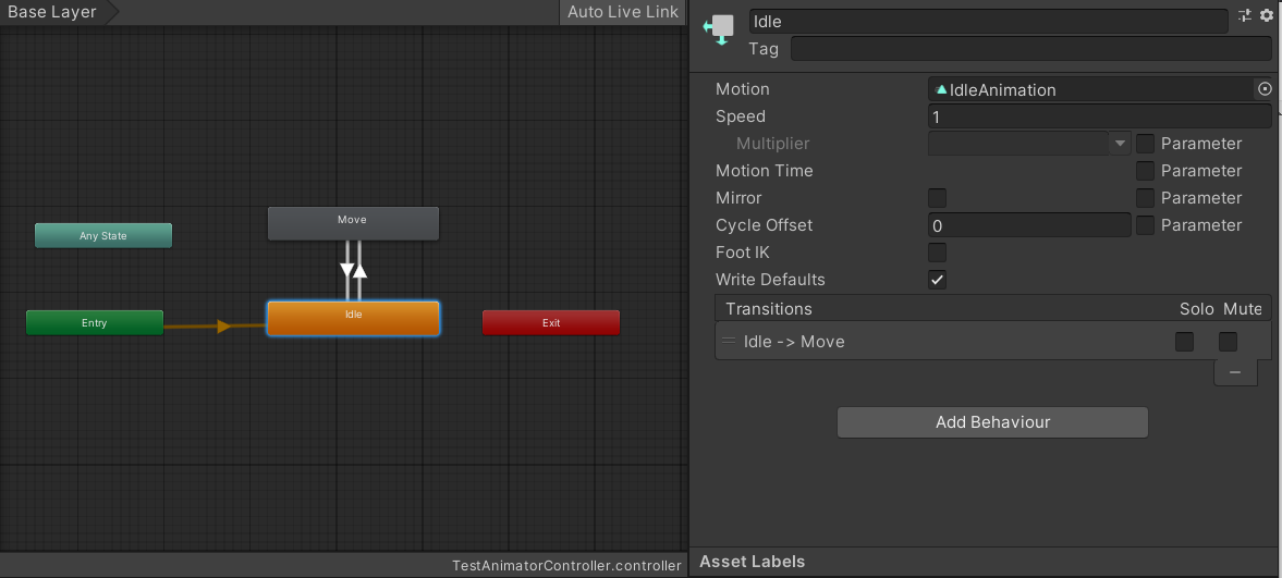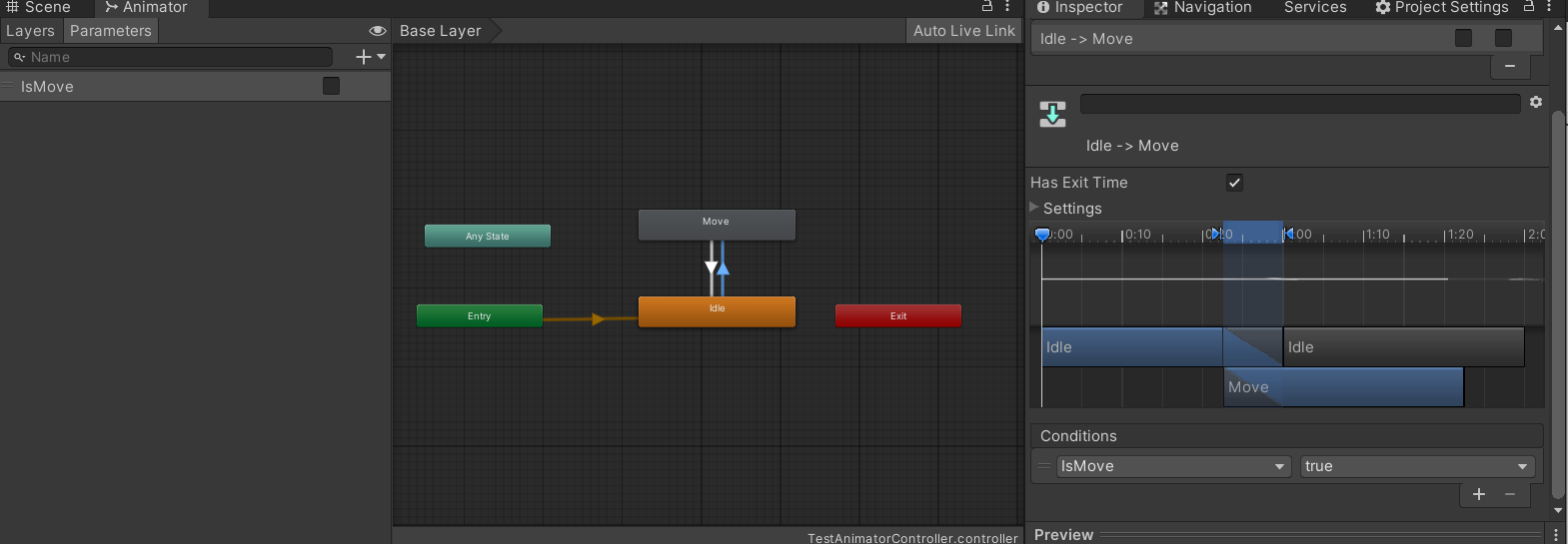 - Transitoin의 Has Exit Time: 끝나는 시간이 있는지 여부. 조건이 만족된 즉시 이동하는지, clip이 끝나야 이동하는지. ex) Exit Time을 0.6으로 설정하면 조건을 만족하더라도 0.6까지 재생이 끝난 후 이동한다.