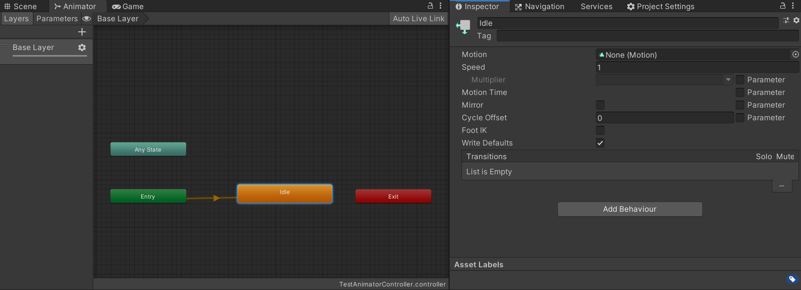 이 노드는 애니메이터가 어떤 애니메이션을 재생하고 있는 상태이던 간에 트랜지션의 조건이 만족되면 무조건 다음 스테이트로 넘어가서 애니메이션을 재생하게 만든다.