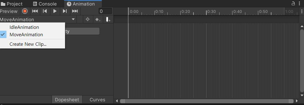 새로운 애니매이션을 추가하거나 변경하고 싶으면 Anmiation탭의 왼쪽 위를 클릭