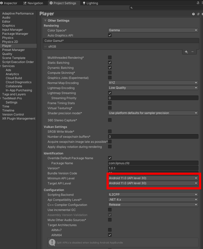 Minimum API Level과 Target API Level을 31에서 30으로 낮춤