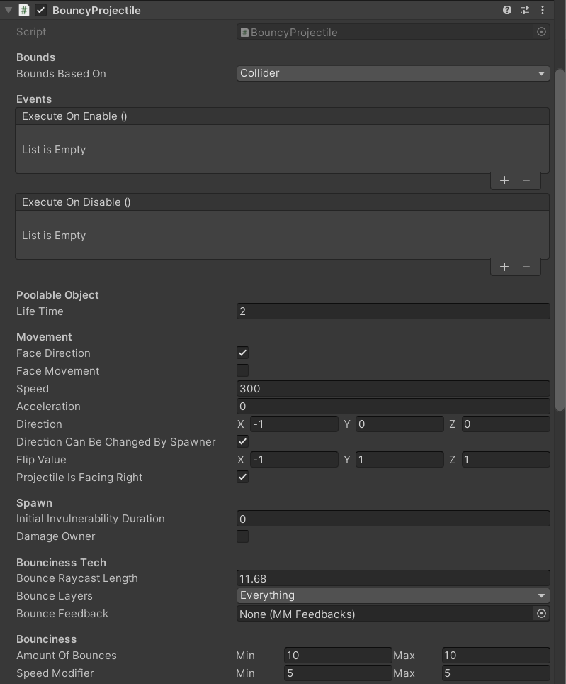 · Amount Of Bounces : 몇번 튕기는지. 튕기다가 총알 자체가 Destroy될 수도 있으니, LifeTime, DamageOnToucch, Health등 연관된 기능들과 같이 체크해봐야 함.