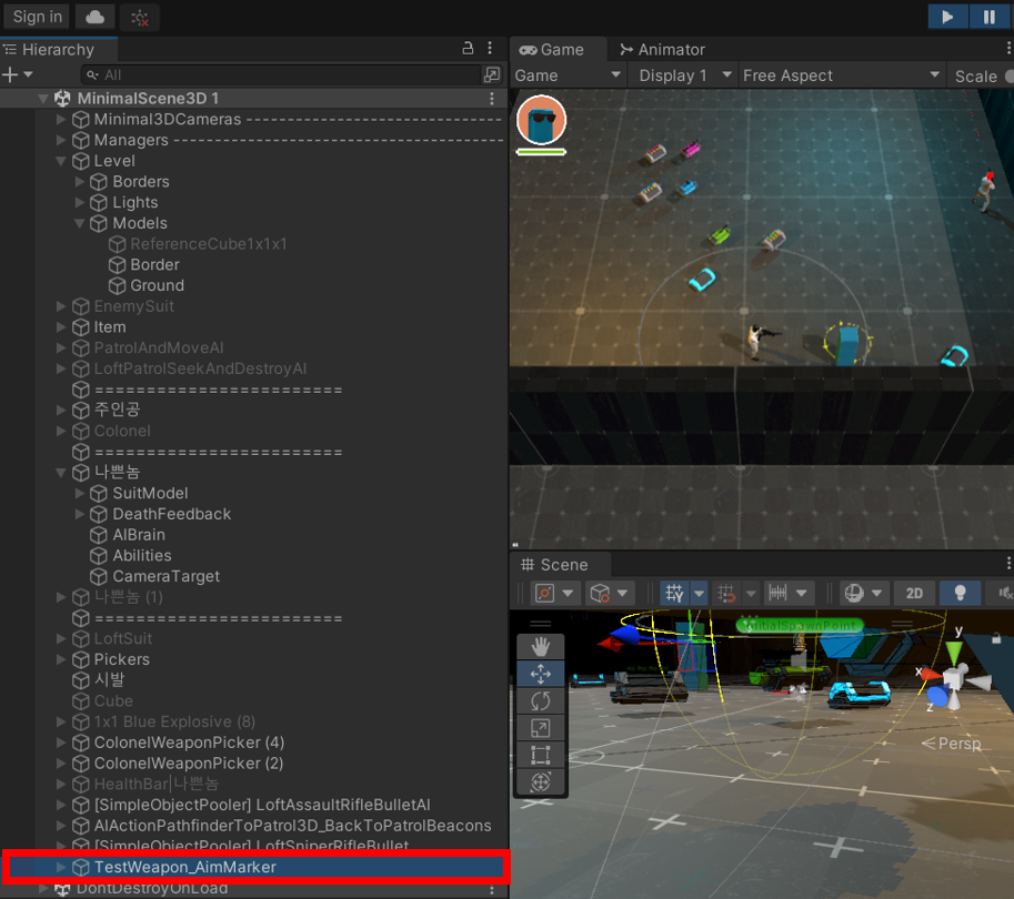 Aim Marker가 정삭 동작하는 경우 Hierachy에 뜨게 됨. 활성화, 비활성화로 작동 파악 가능.