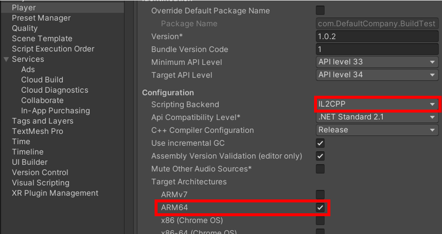 - Configuration ์น์ ์์ Scripting Backend๋ฅผ IL2CPP๋ก ์ค์ ํฉ๋๋ค.