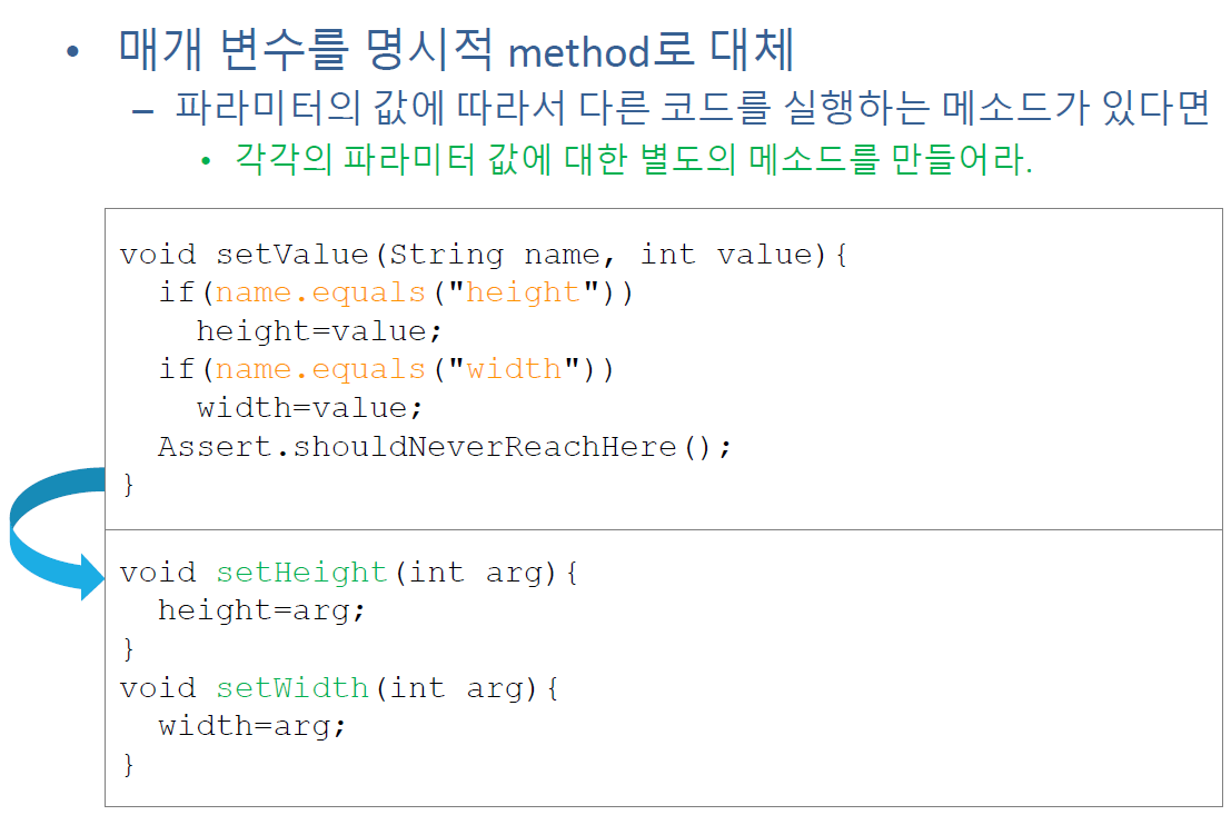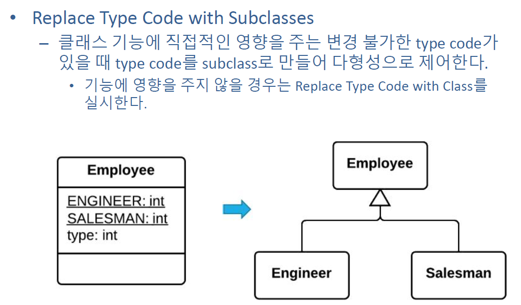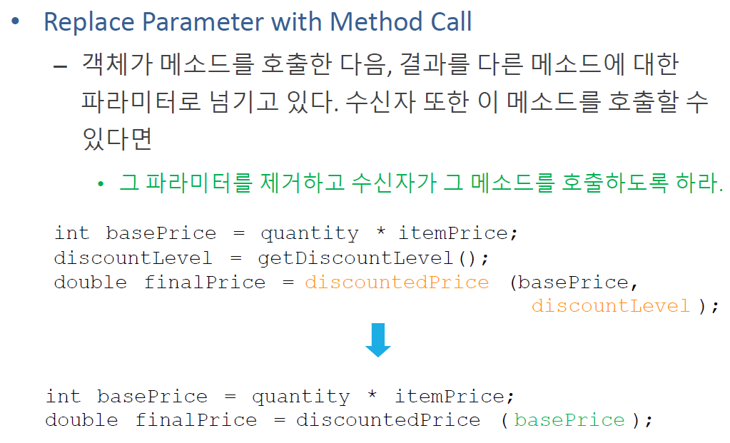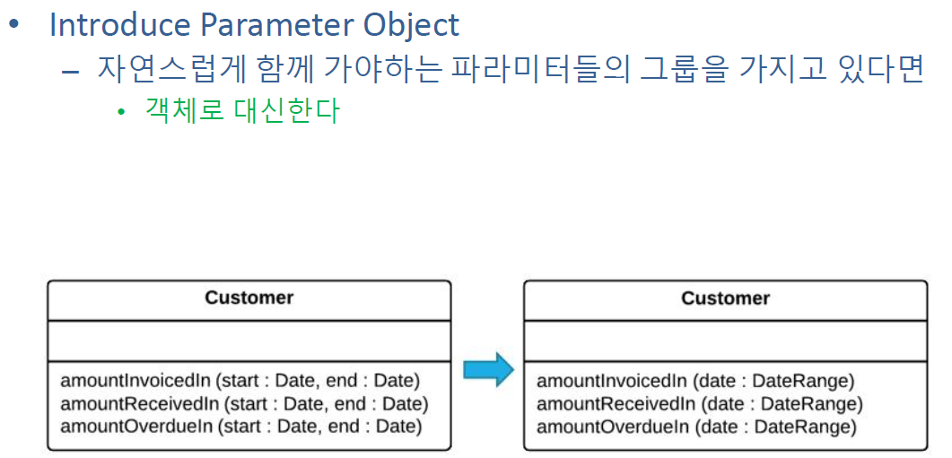 조건문 분해하기 if조건문이 주절주절이면 의미를 확인하기 어려우므로, 매소드로 빼내는 것. 이건 원래 하던거네.. before import java.time.LocalDate; public class DecomposeConditional_before { static class Stadium { //... public double summerRate; public double winterRate; public double winterServiceCharge; public Stadium(double summerRate, double winterRate, double winterServiceCharge) { super(); this.summerRate = summerRate; this.winterRate = ..