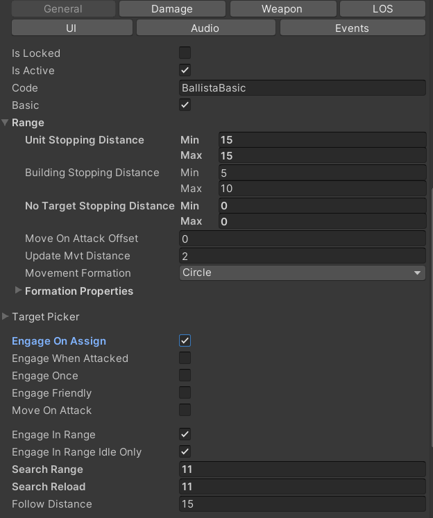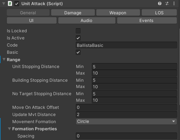 당연히 있어야 될 것 같은 사정거리라는 변수가 없어서 어떤 구조인지 파악하기가 힘들었다. ① 상대편 유닛을 공격할때 사정거리를 설정하는 경우 (Unit Stopping Distance) Unit Stop Distance 값을 조정 Unit/Building Stopping Distance: When moving towards a target unit/building, this field is the minimum and maximum allowed stopping distance value for that movement. 일단 Max가 사정거리. 코드 보면.. (min=true) Max거리 밖에서 적을 마우스로 직접 찍으면 Min 거리에 가서 쏨 (min=false) 이외에는 Max거리까지 가서 쏘거나 ..