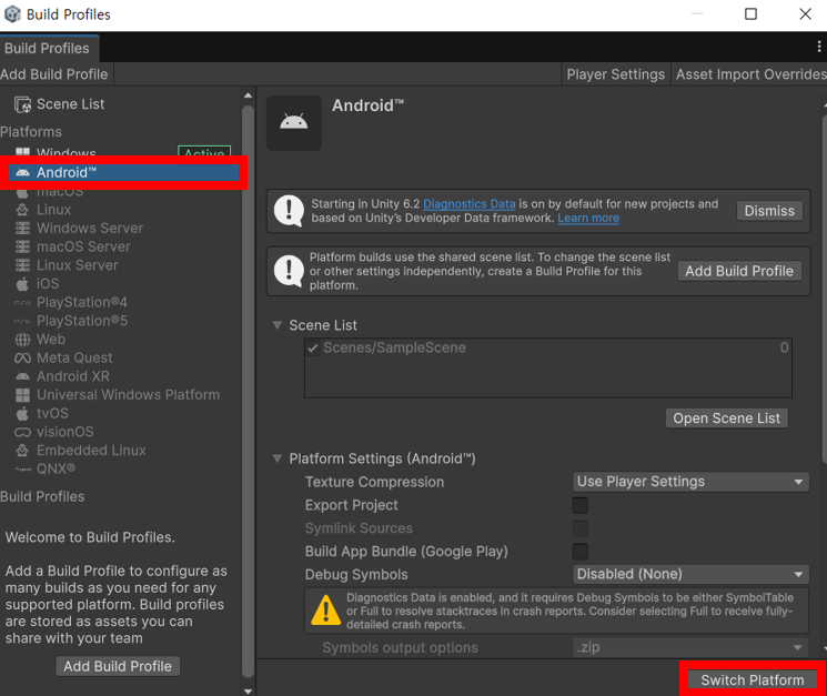 · “Android” 선택 후 “Switch Platform” 버튼 선택